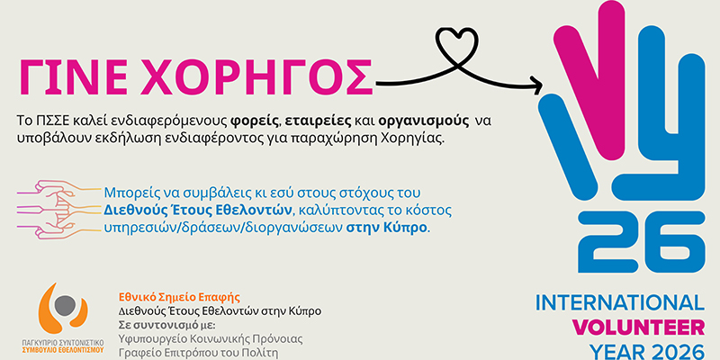Το Διεθνές Έτος Εθελοντών στην Κύπρο μπορεί να περιλαμβάνει συναρπαστικές δράσεις και πρωτοβουλίες που θα κάνουν το 2026 να είναι μια χρονιά πραγματικά αφιερωμένη στις εθελόντριες και στους εθελοντές μας!