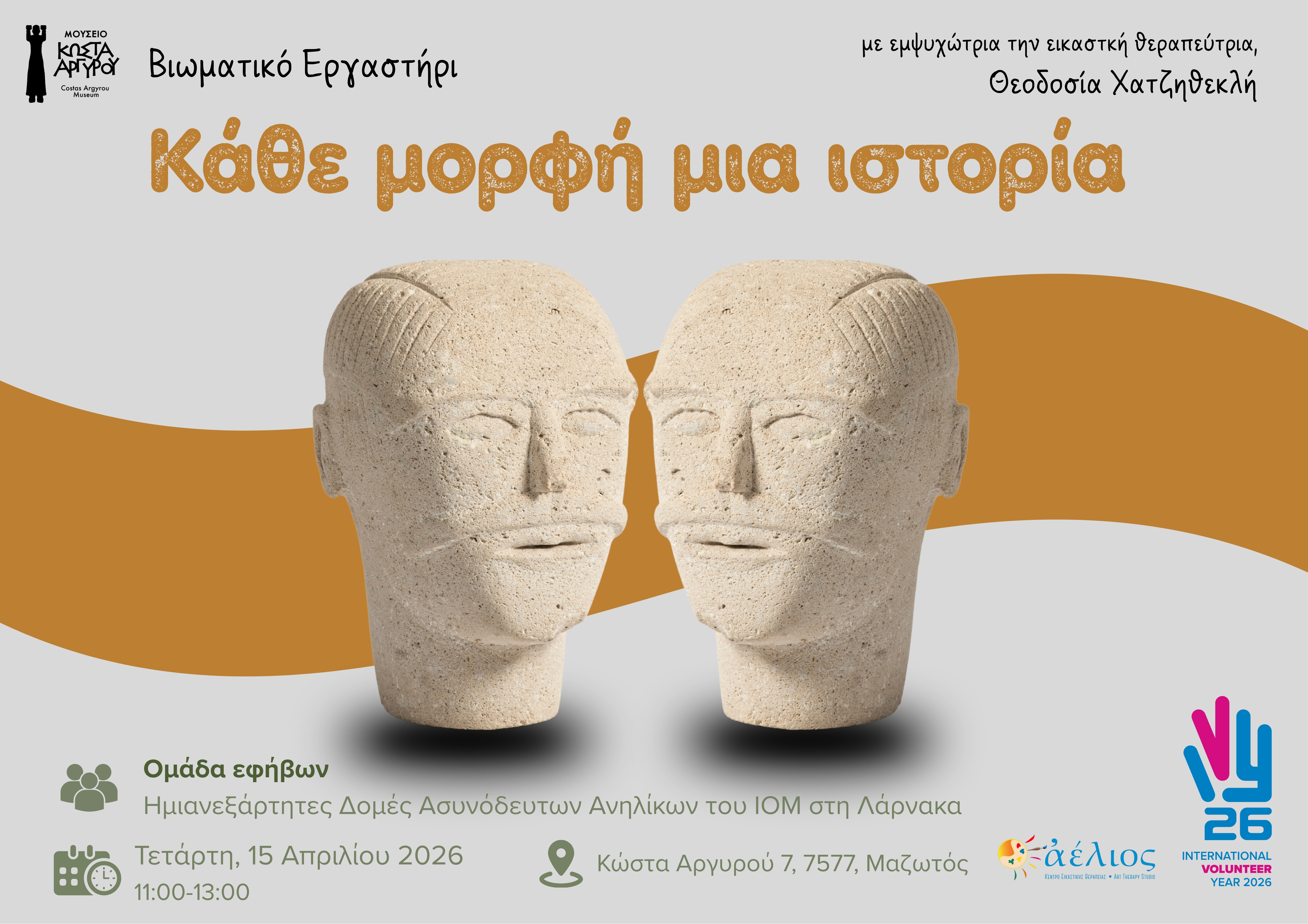 Το Μουσείο Κώστα Αργυρού διοργανώνει, σε συνεργασία με την εικαστική θεραπεύτρια και εμψυχώτρια ,κα Θεοδοσία Χατζηθεκλή, ένα βιωματικό εργαστήρι με στόχο την ενίσχυση της δημιουργικής έκφρασης, της κοινωνικής ένταξης και της συμμετοχής των νέων στον πολιτισμό μέσα από τον εθελοντισμό. Το εργαστήρι εμπνέεται από τα γλυπτά που εκτίθενται στο Μουσείο και από τον τρόπο με τον οποίο ο γλύπτης χρησιμοποιούσε απλές ανθρώπινες μορφές για να αφηγηθεί ιστορίες και εμπειρίες.