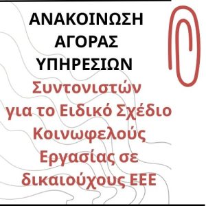 Ανακοίνωση Αγοράς Υπηρεσιών – Τίτλος:  Αίτηση για Αγορά Υπηρεσιών Συντονιστών  για το Ειδικό Σχέδιο Κοινωφελούς Εργασίας σε δικαιούχους ΕΕΕ με σκοπό την απόκτηση επαγγελματικής εμπειρίας στο πλαίσιο Κοινωνικής Παρέμβασης – Ανακοίνωση
